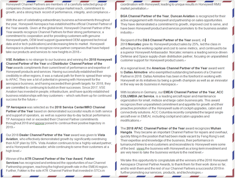 霍尼韋爾祝賀了所有獲得2018霍尼韋爾航空渠道合作伙伴獎的公司,感謝他們的努力付出,也希望他們和其他的渠道合作伙伴一道能在2019年推廣霍尼韋爾的服務、產品和技術上取得成功。